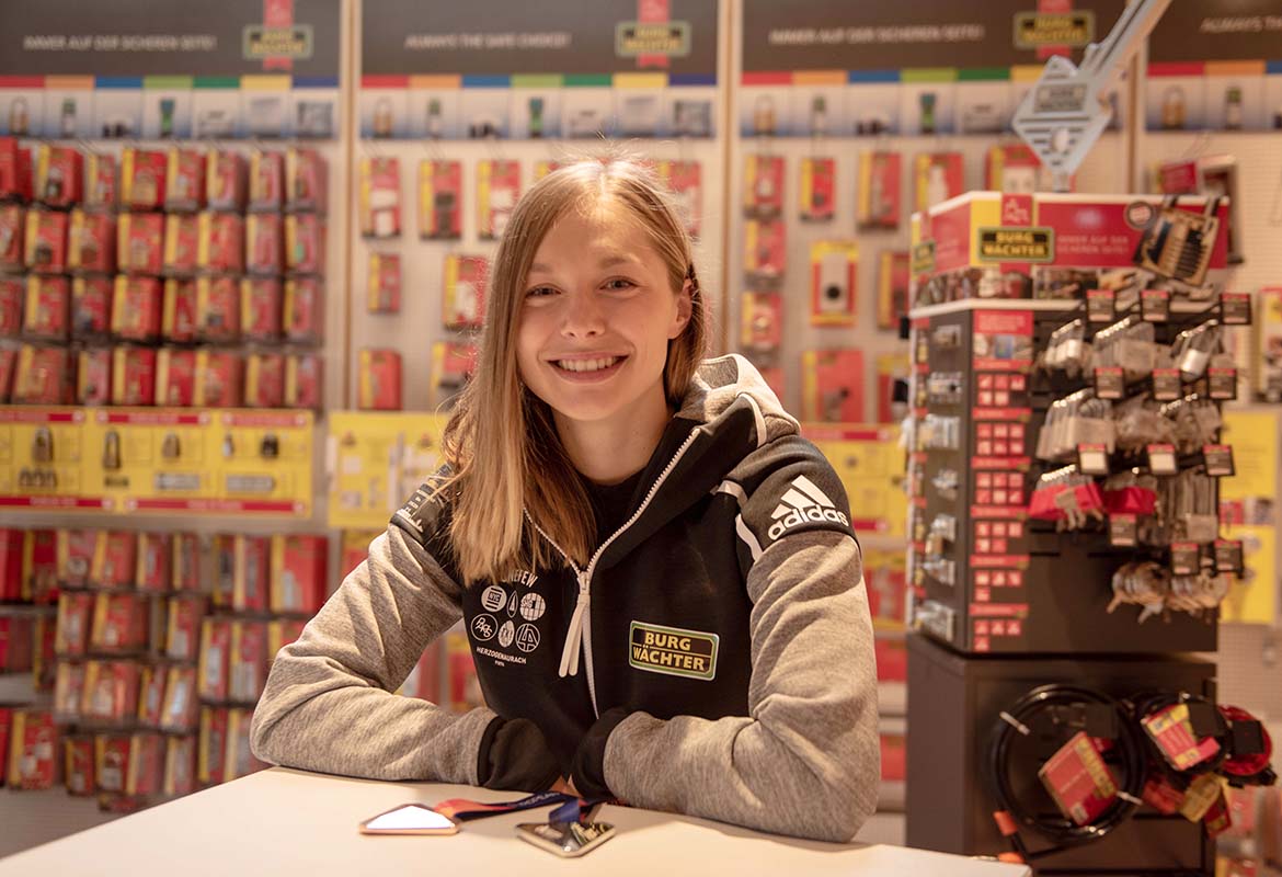 Am Mittwoch entdeckte sie allerdings zunächst, was alles in den verschiedenen Produkten von BURG-WÄCHTER steckt. Verschiedene Tresore, das elektronische Türschließsystem secuENTRY, Tür- und Fenstersicherungen, Schlösser und Briefkästen testete die Weltklasse-Sprinterin. Als sie erfuhr, dass der schwerste Tresor aus dem BURG-WÄCHTER Programm satte 2,2 Tonnen auf die Waage bringt, war sie sichtlich überrascht: „Das ist ja viel schwerer als mein Auto!“ Im Anschluss lernte die Soesterin die Mitarbeiter in der Firmenzentrale kennen und stand natürlich für Fotos und Autogramme zu Verfügung. „BURG-WÄCHTER ist mein langjährigster Partner. Ich bin sehr dankbar, dass die Firma schon so lange an meiner Seite steht. Schließlich gibt es kaum ein Unternehmen, das Sportler schon im Jugendalter unterstützt“, sagt Gina Lückenkemper. Die 21-Jährige zählt mit sieben anderen Leichtathleten aus ganz Deutschland zum Trackteam BURG-WÄCHTER. Ziel des Teams ist es, die jungen Athleten auf ihrem Weg in die Spitze zu begleiten und zu fördern.