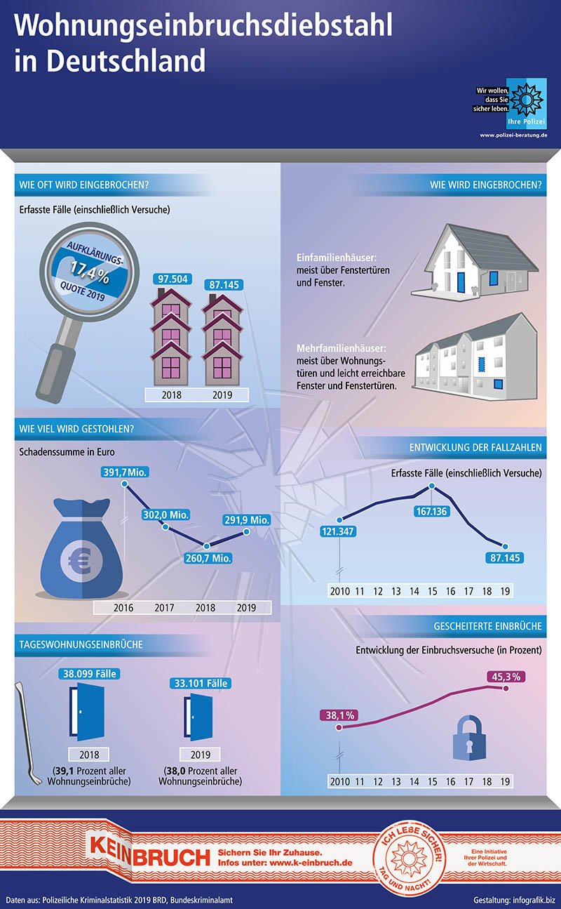 Eine gute Nachricht mitten in der Corona-Krise! Die Einbruchzahlen in Deutschland sind erneut deutlich gesunken. 2019 verzeichnete die Polizeiliche Kriminalstatistik (PKS) einen Rückgang um 10,6 Prozent auf 87.145 Fälle. Gründe für den Rückgang sind immer besser gesicherte Häuser und Wohnungen sowie das verschärfte Strafrecht.