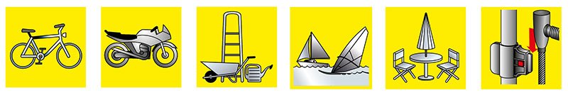 Die Gesamtlänge des Seilschlosses 560 beträgt 90 cm und ermöglicht so ein angenehmes Sichern Ihres Fahrrads. Des Weiteren ist das Schloss 560 ideal zur Sicherung von Gartenmöbeln und Handwerker-Bedarf geeignet